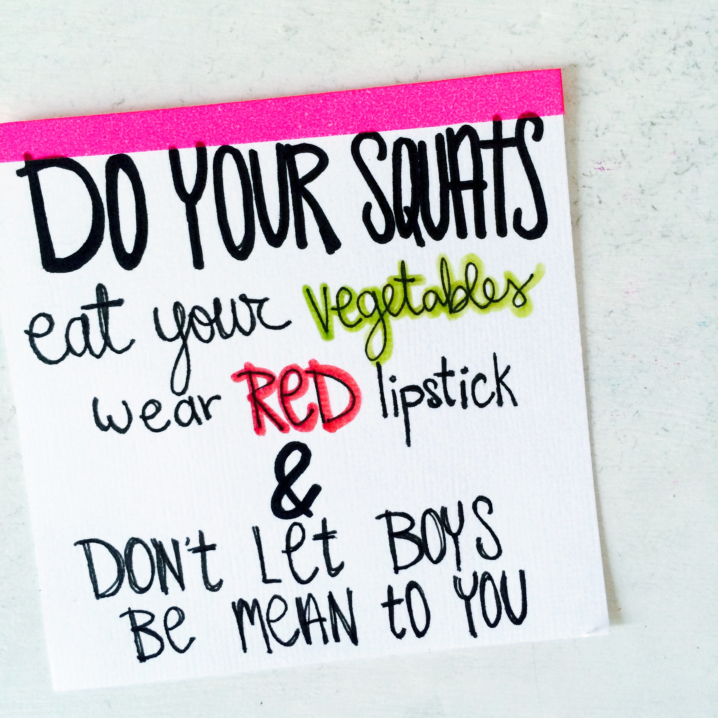 This is one of my all time favorite quotes. “do your squats, eat your vegetables, wear red lipstick, and don’t let boys be mean to you.” Okay, so maybe it’s not a quote, more of a motto, but either way, I love it. Especially the last one. Don’t let boys be mean to you.